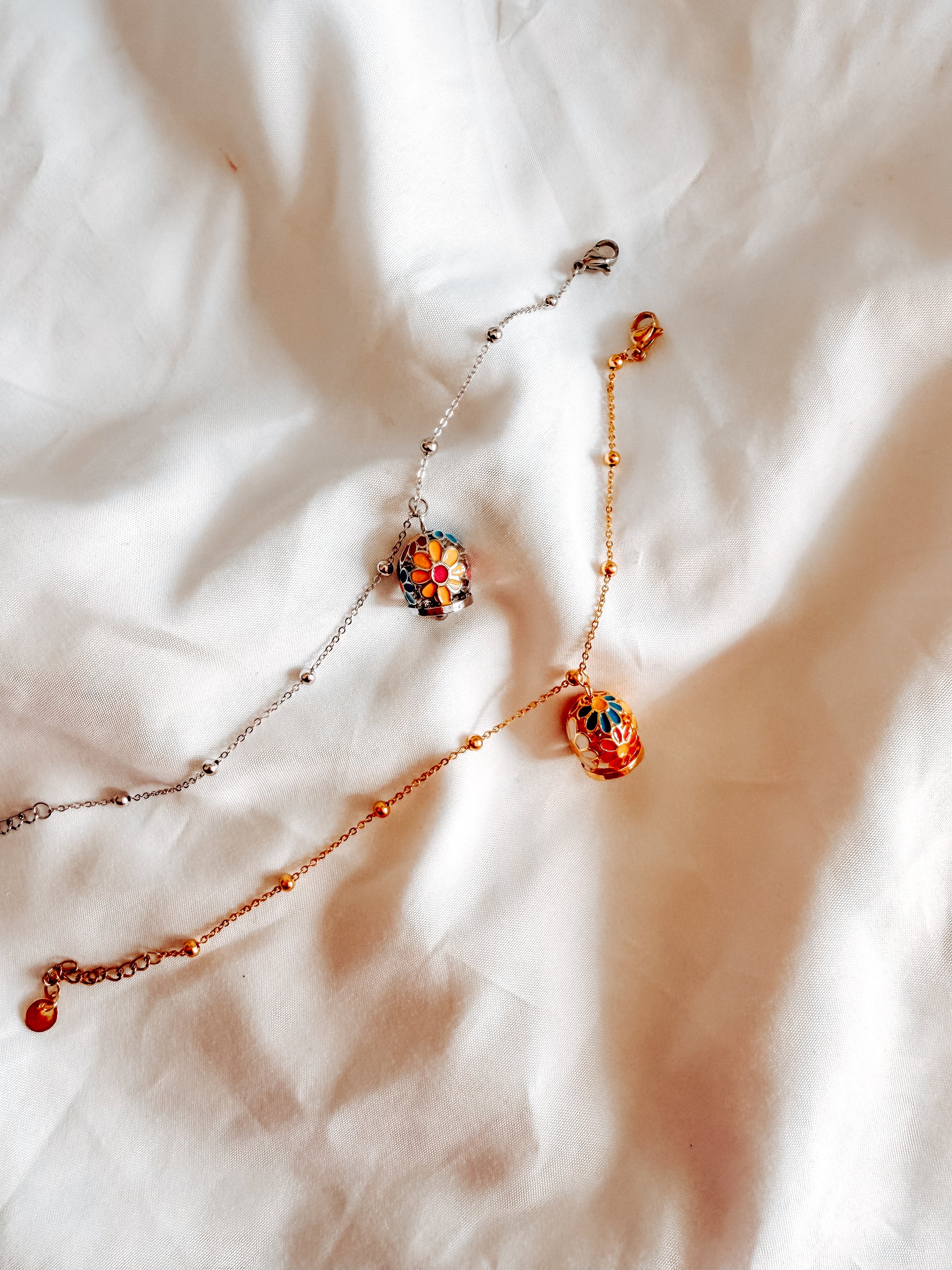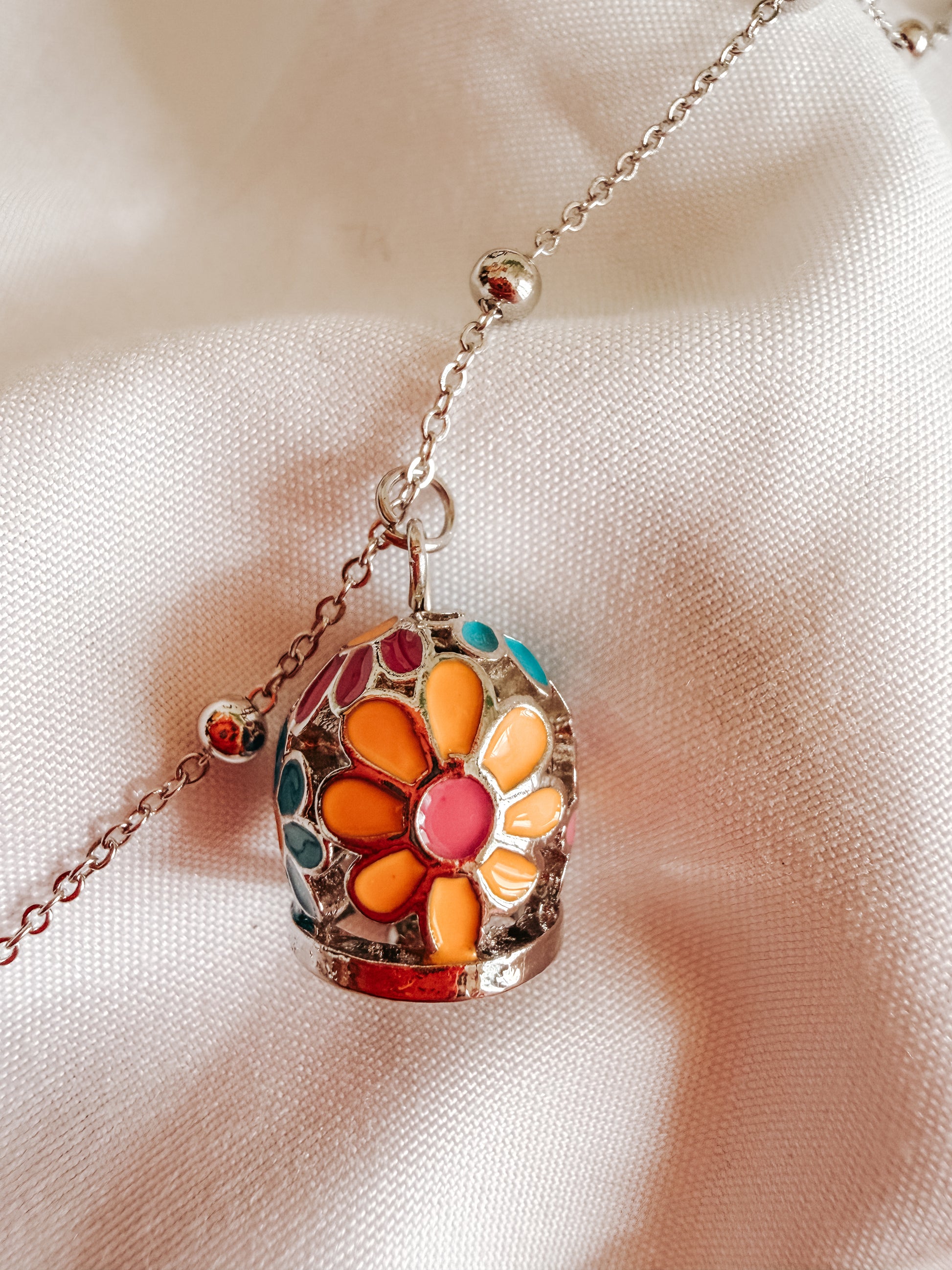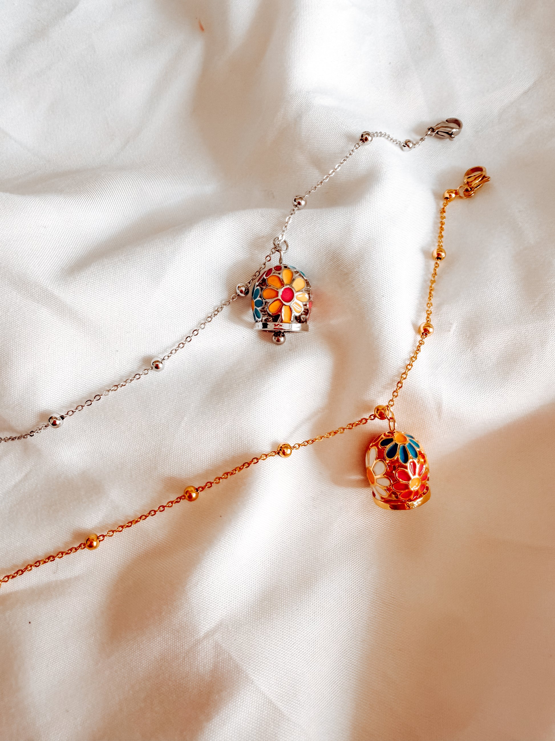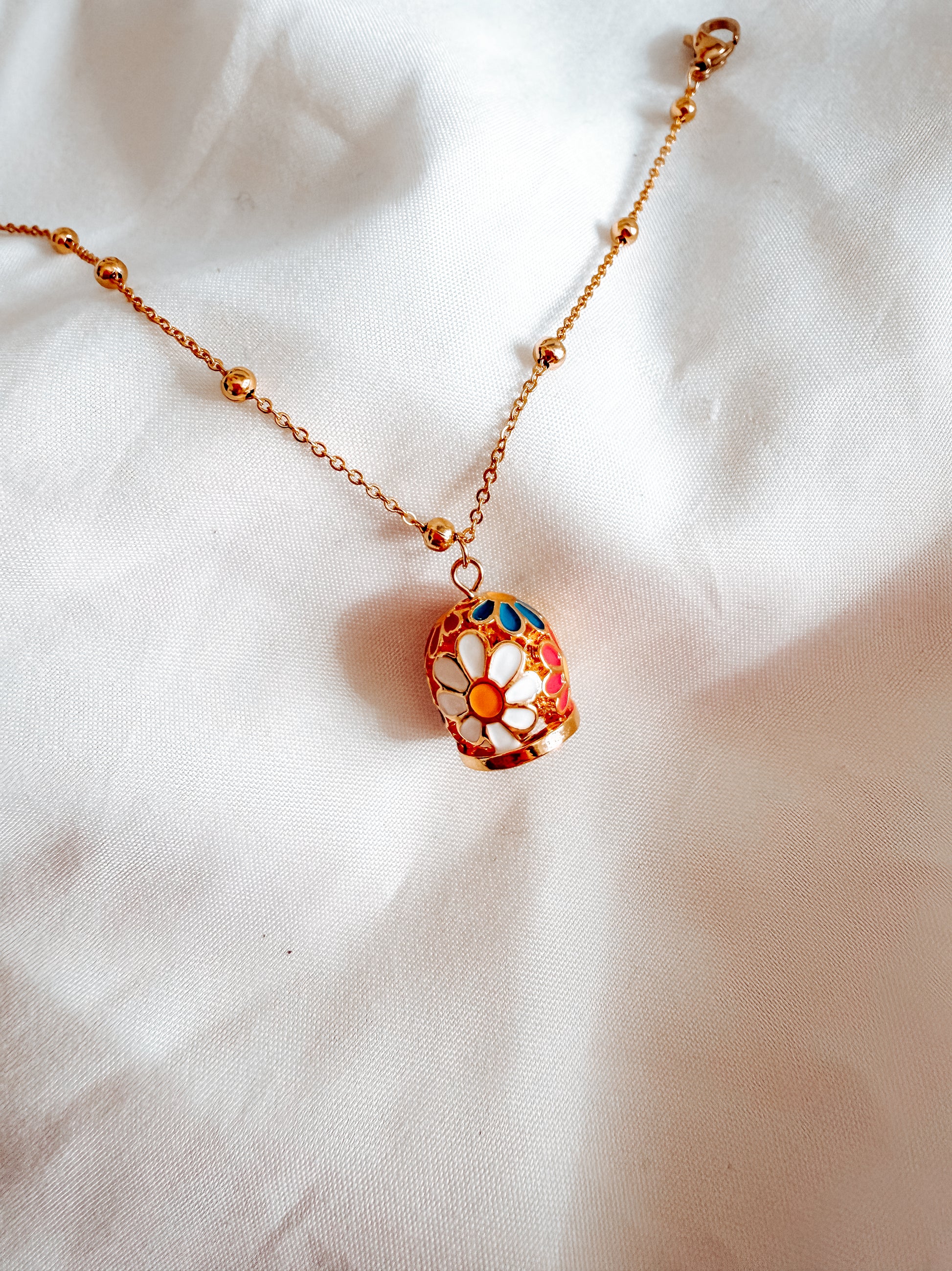 bracciale tessa con ciondoli a campana con fantasia floreale. in acciaio inox. Catena con pallini.