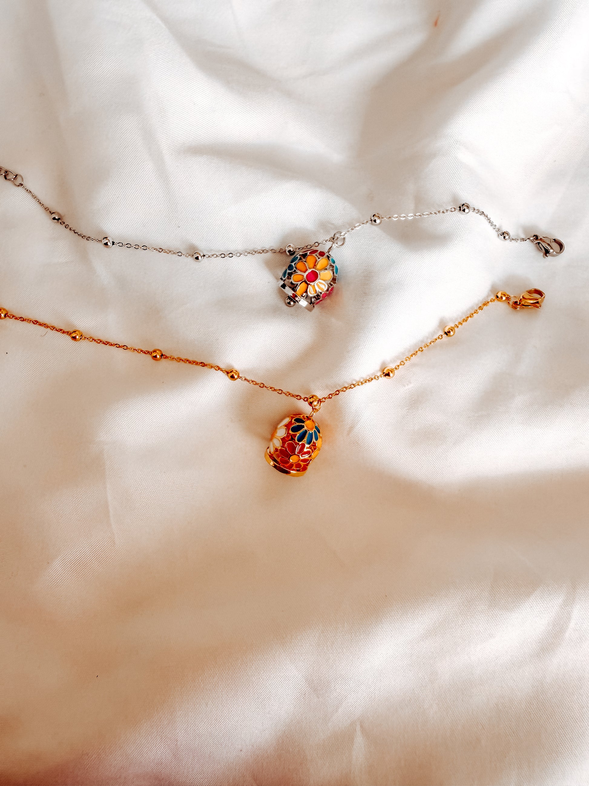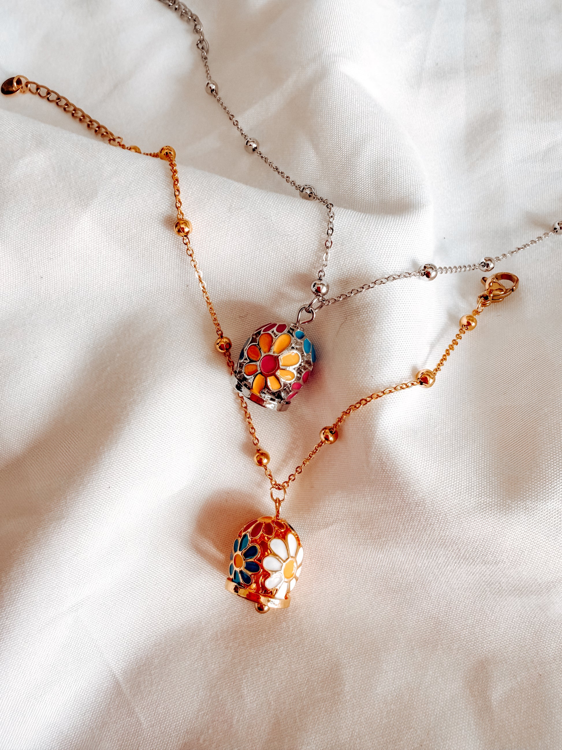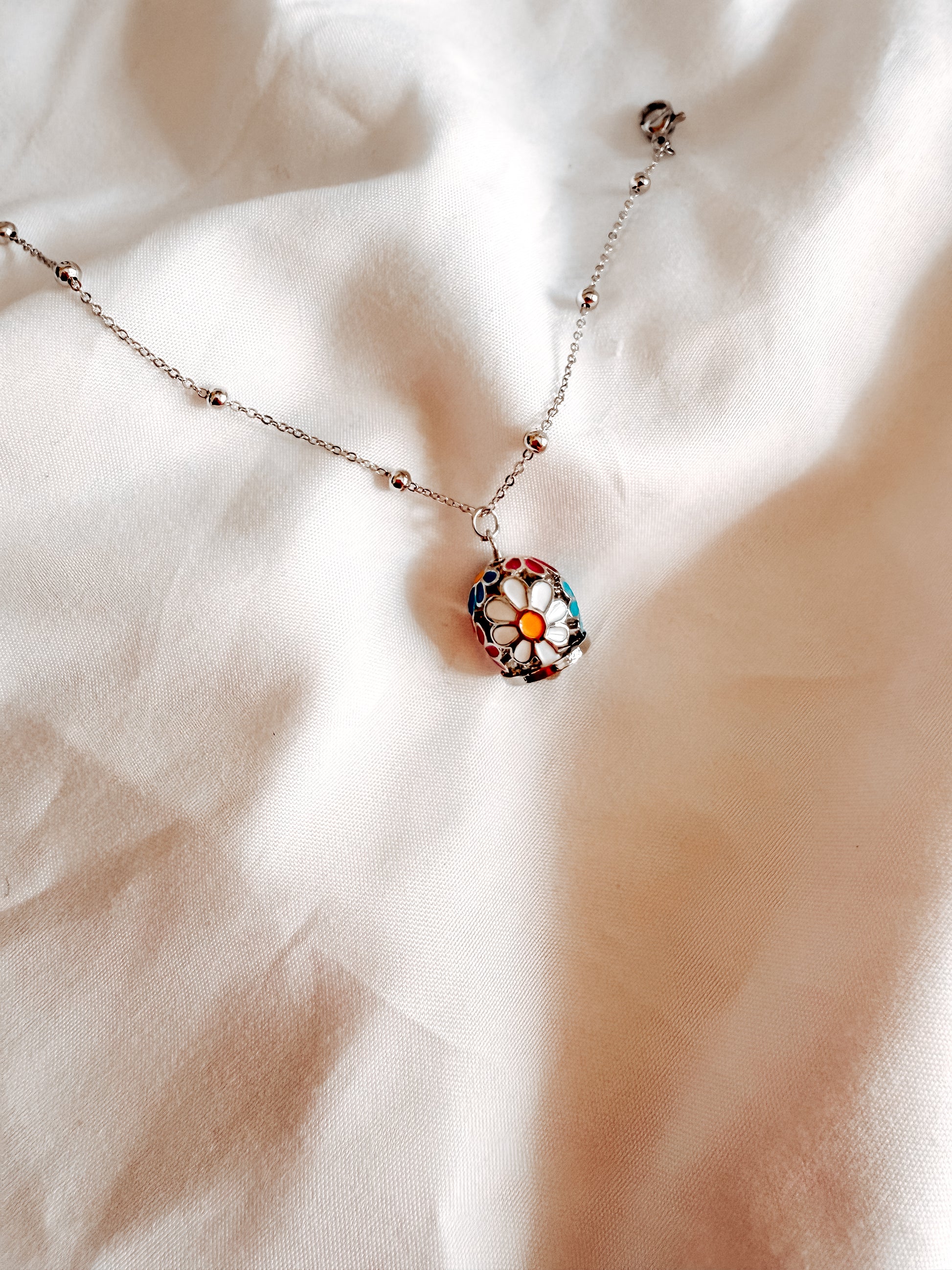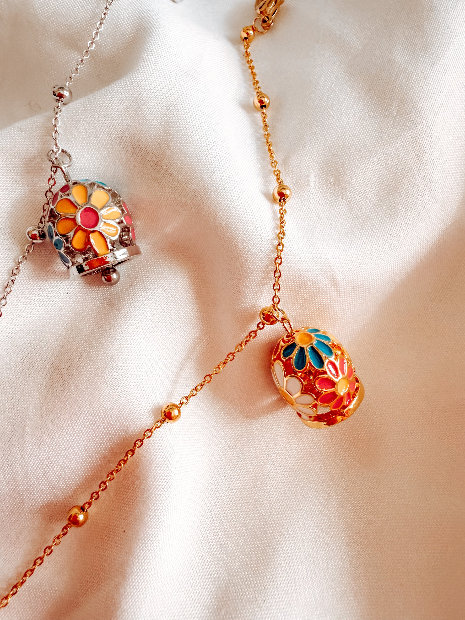bracciale tessa con ciondoli a campana con fantasia floreale. in acciaio inox. Catena con pallini.
