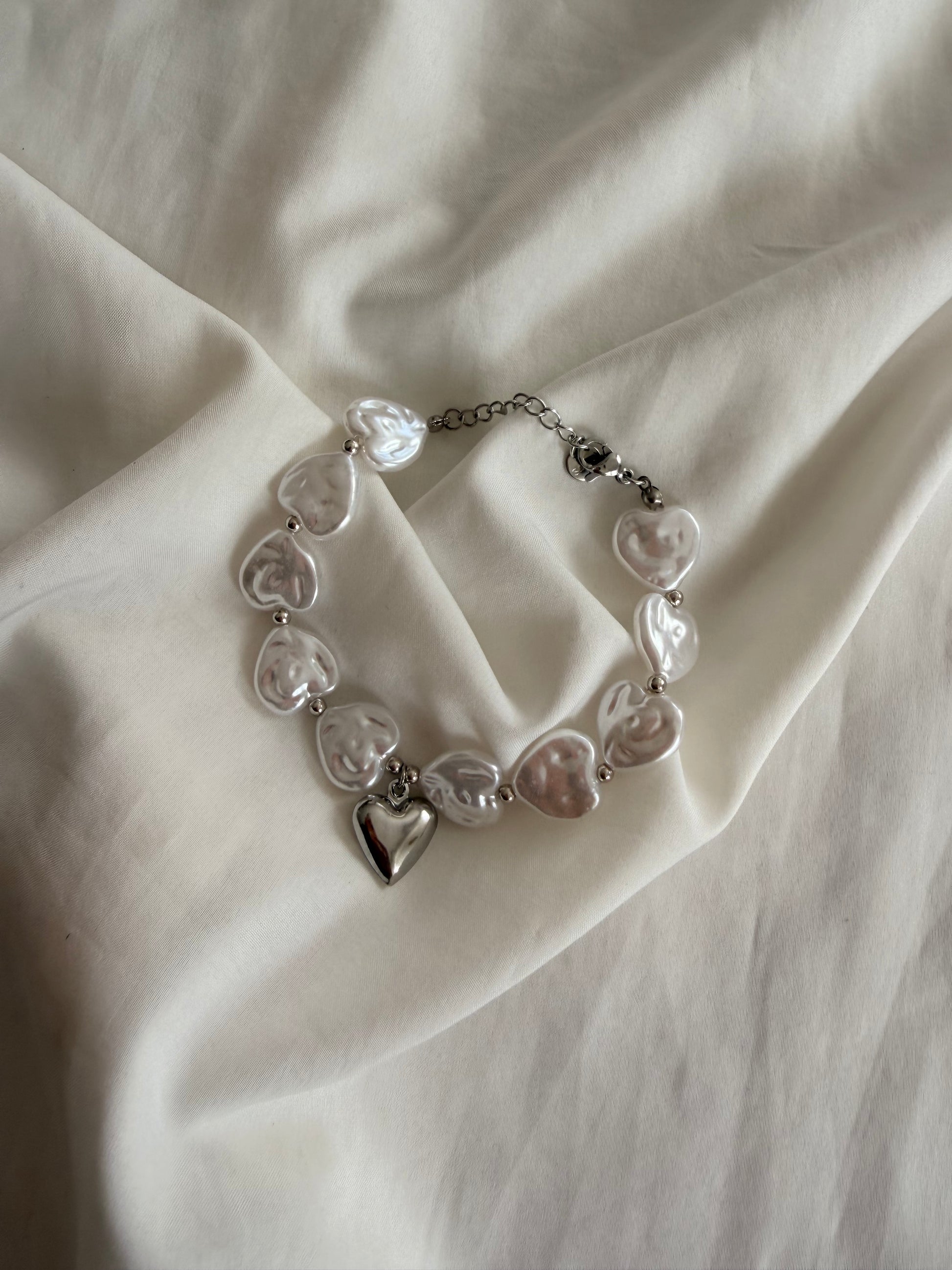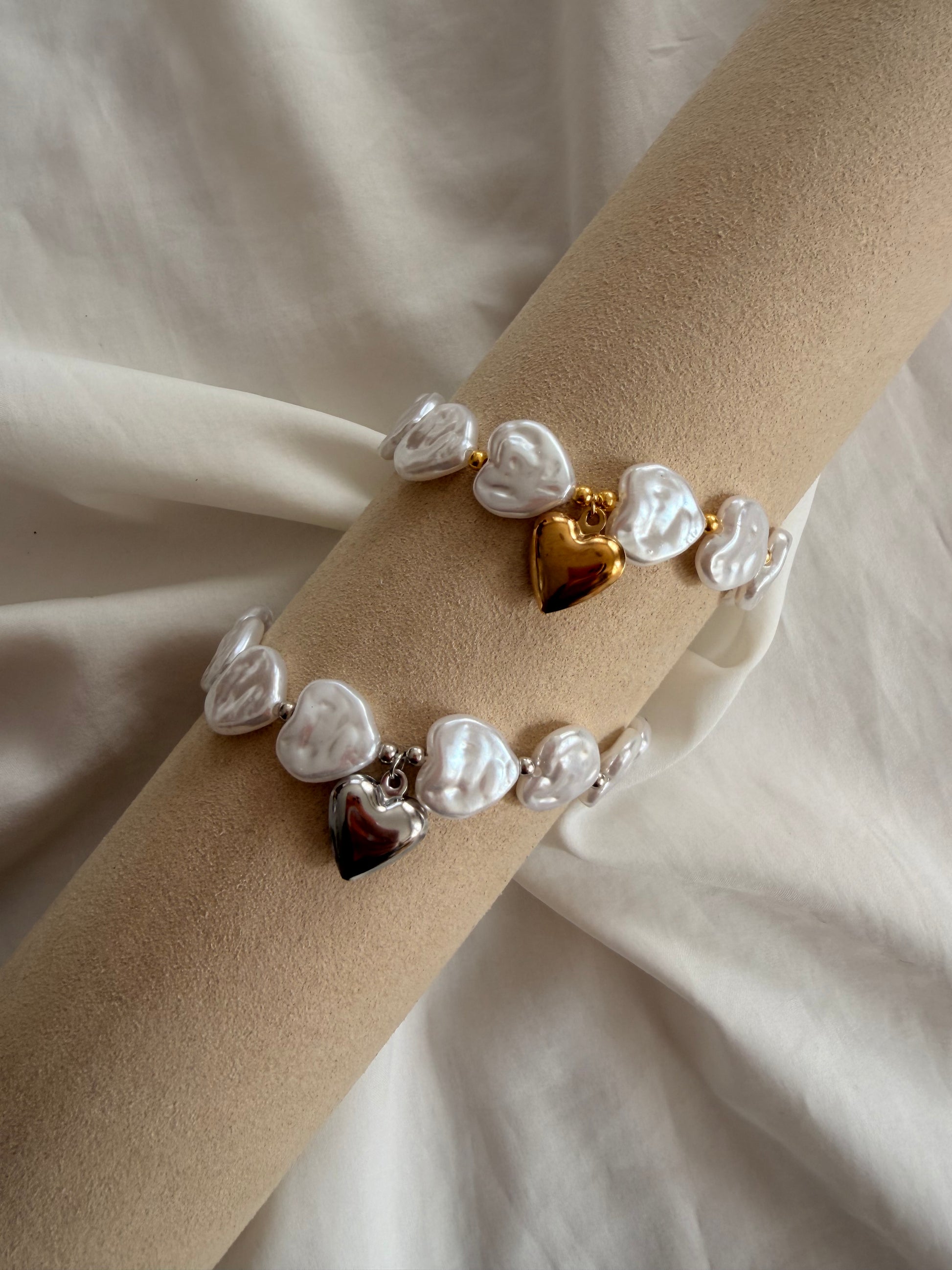 Bracciale Diana in acciaio inox con perle e ciondolo a cuore. In oro e argento