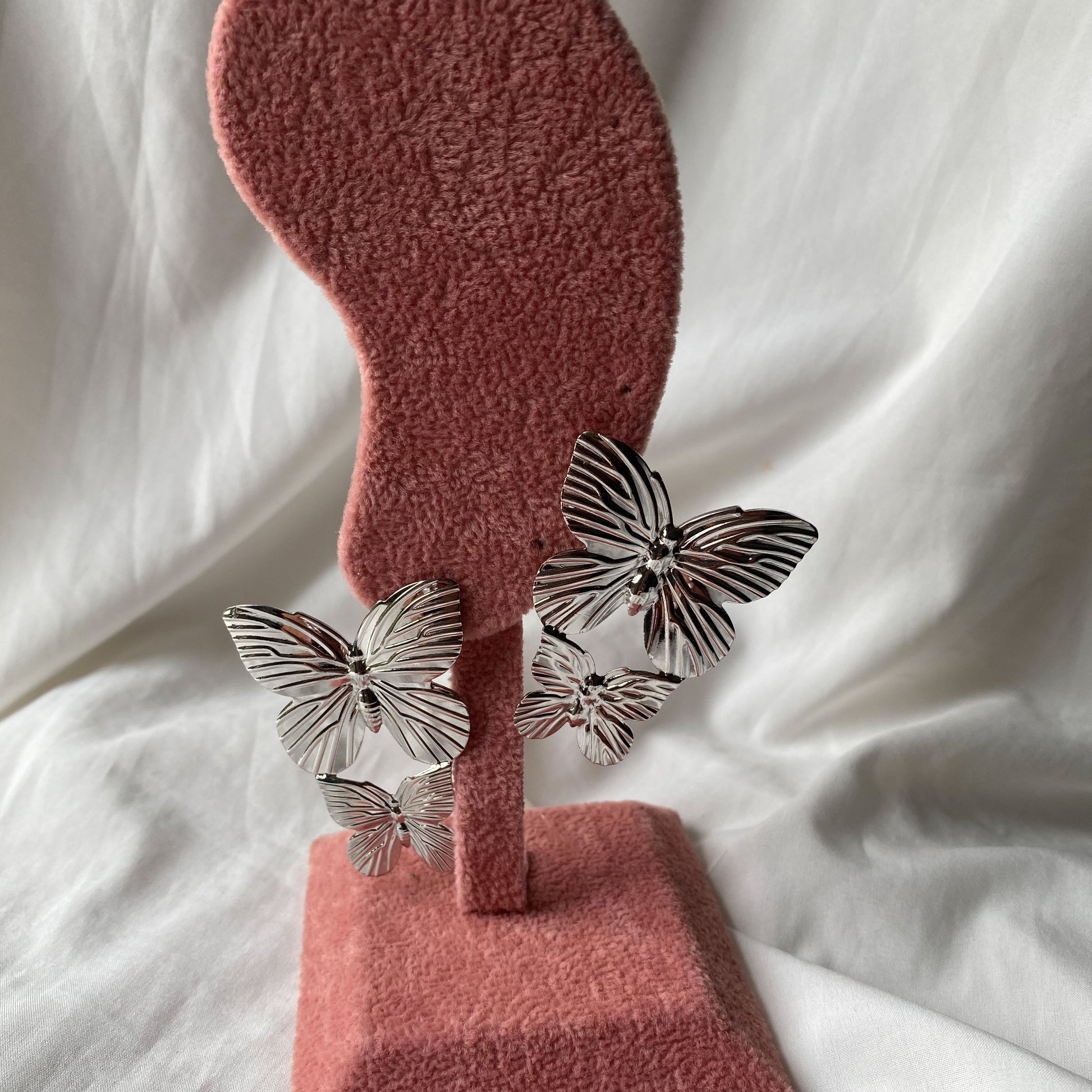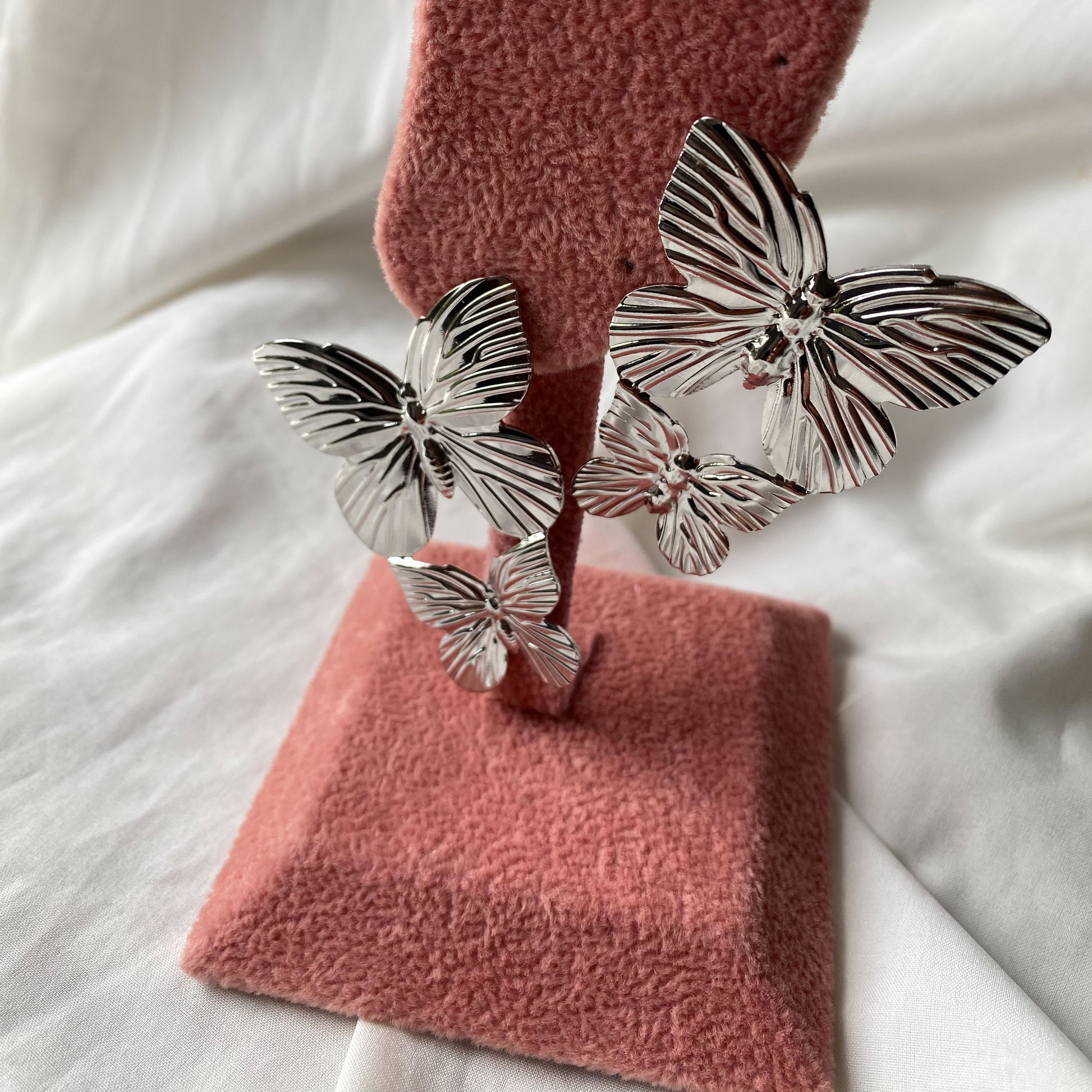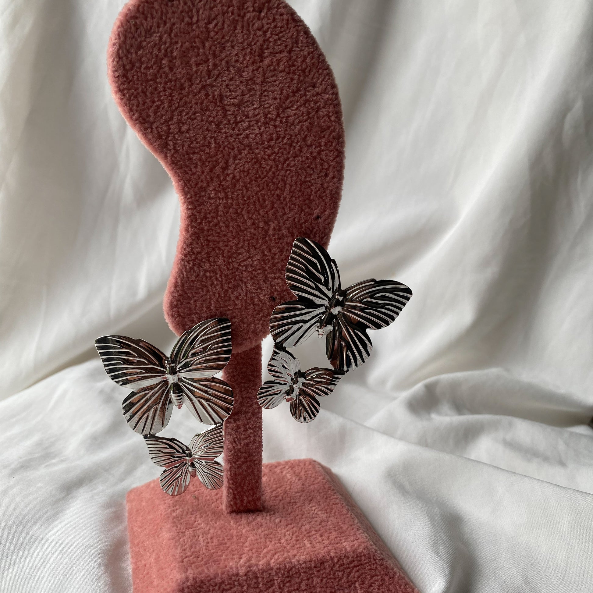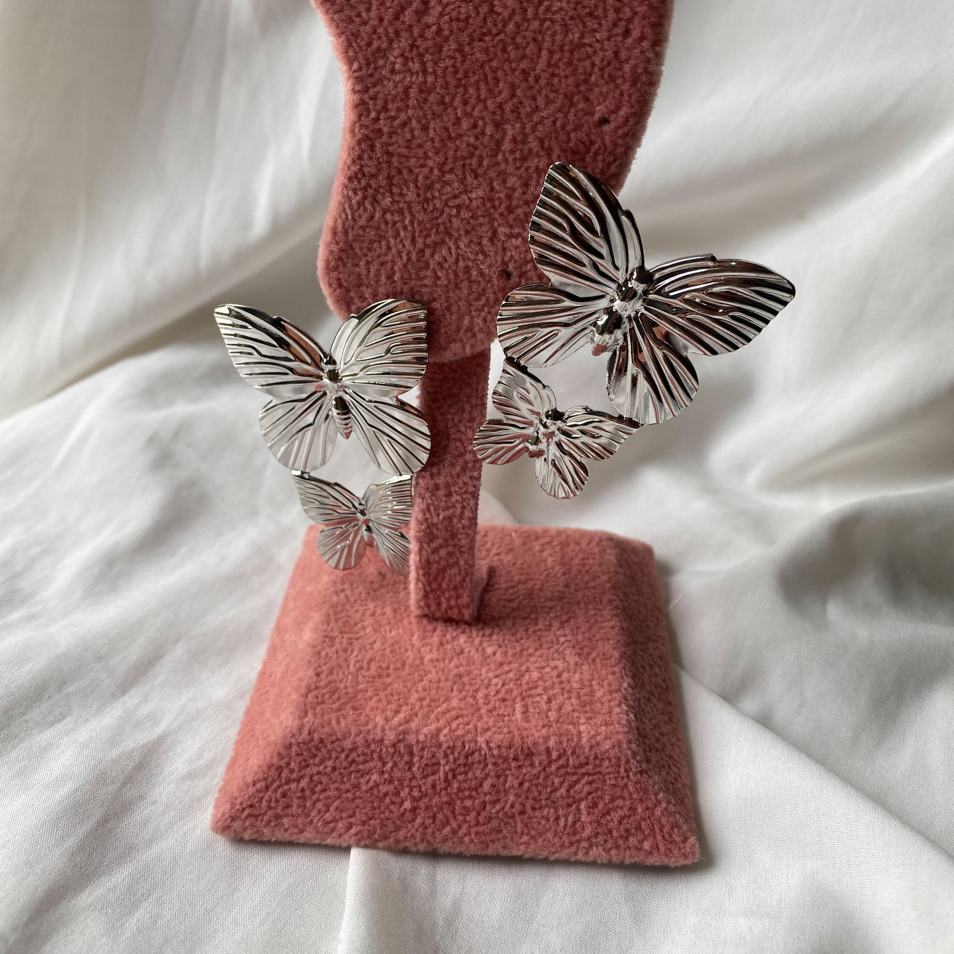 Orecchini Pendenti con doppia farfalla. In acciaio inox. Disponibili in oro o argento.