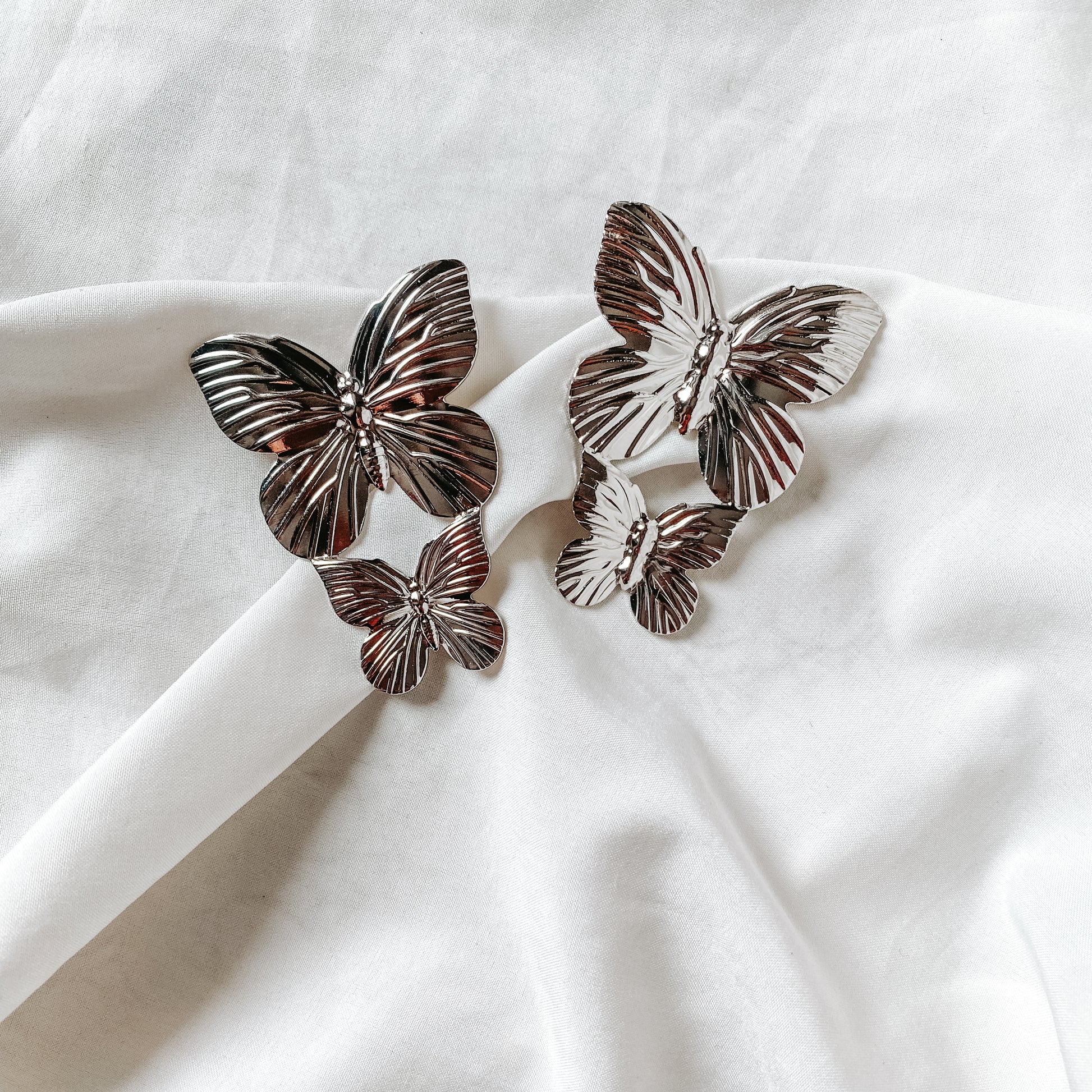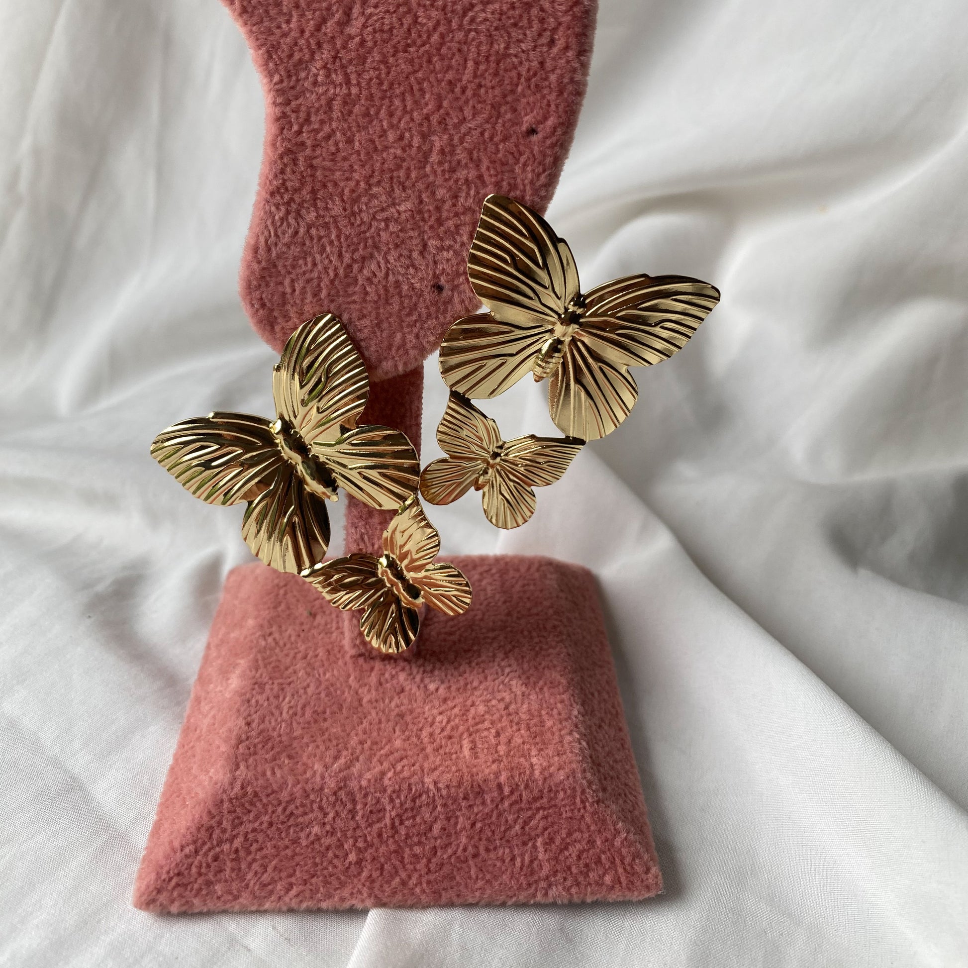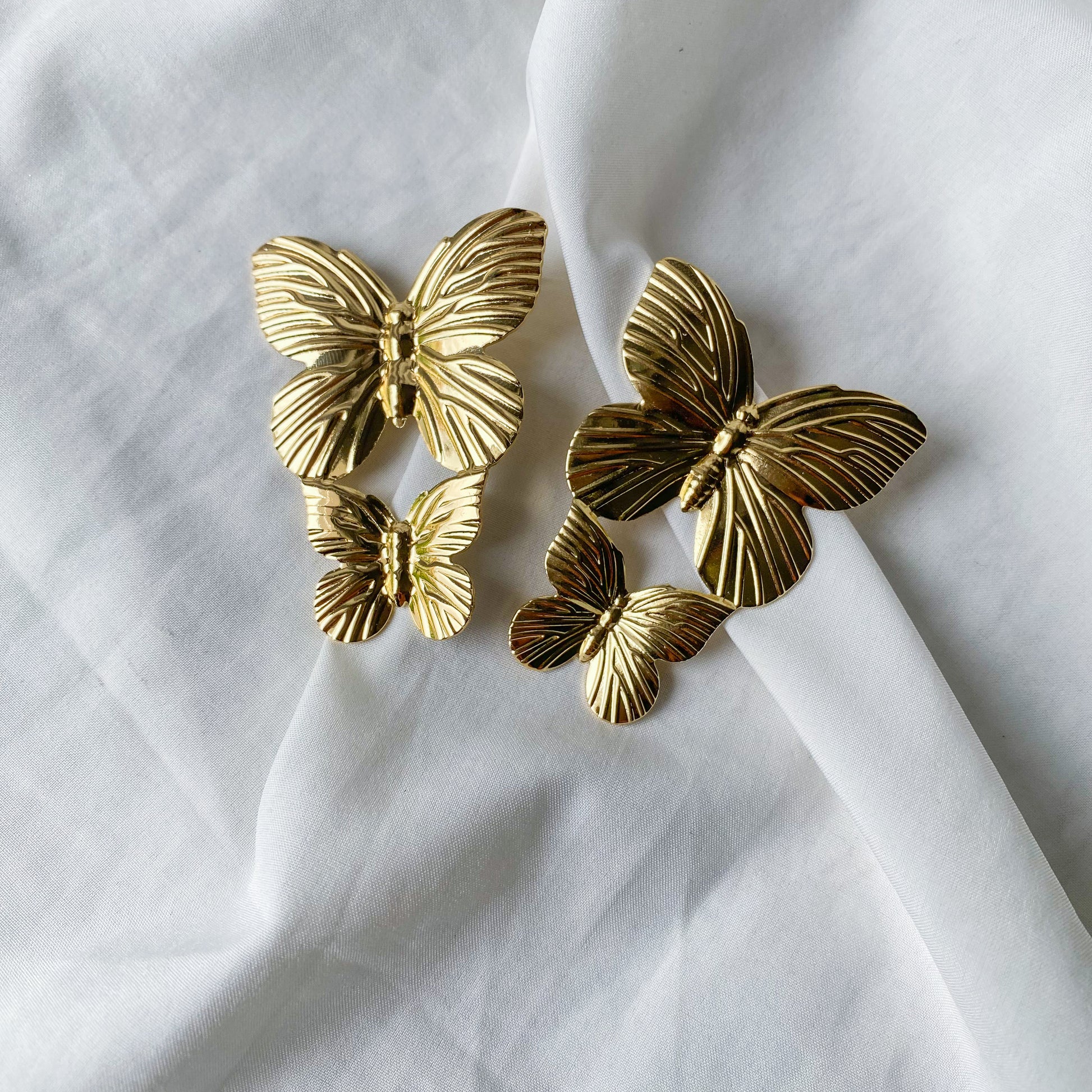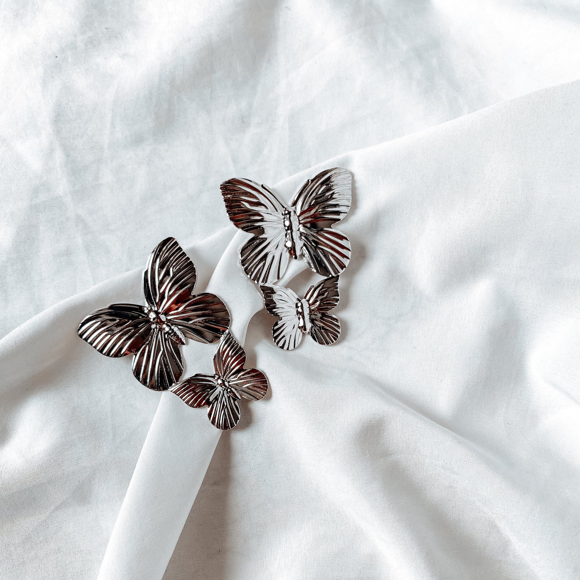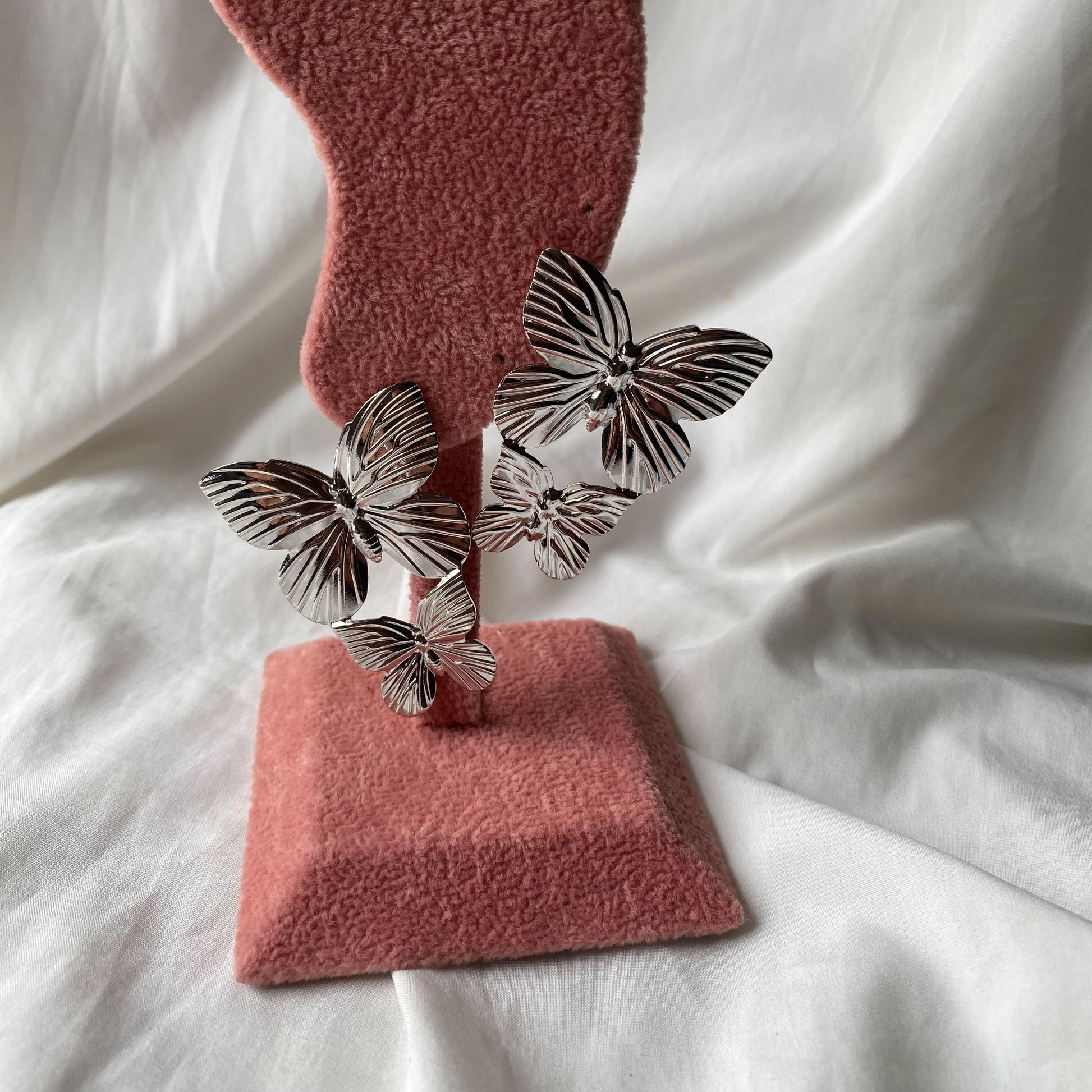 Orecchini Pendenti con doppia farfalla. In acciaio inox. Disponibili in oro o argento.