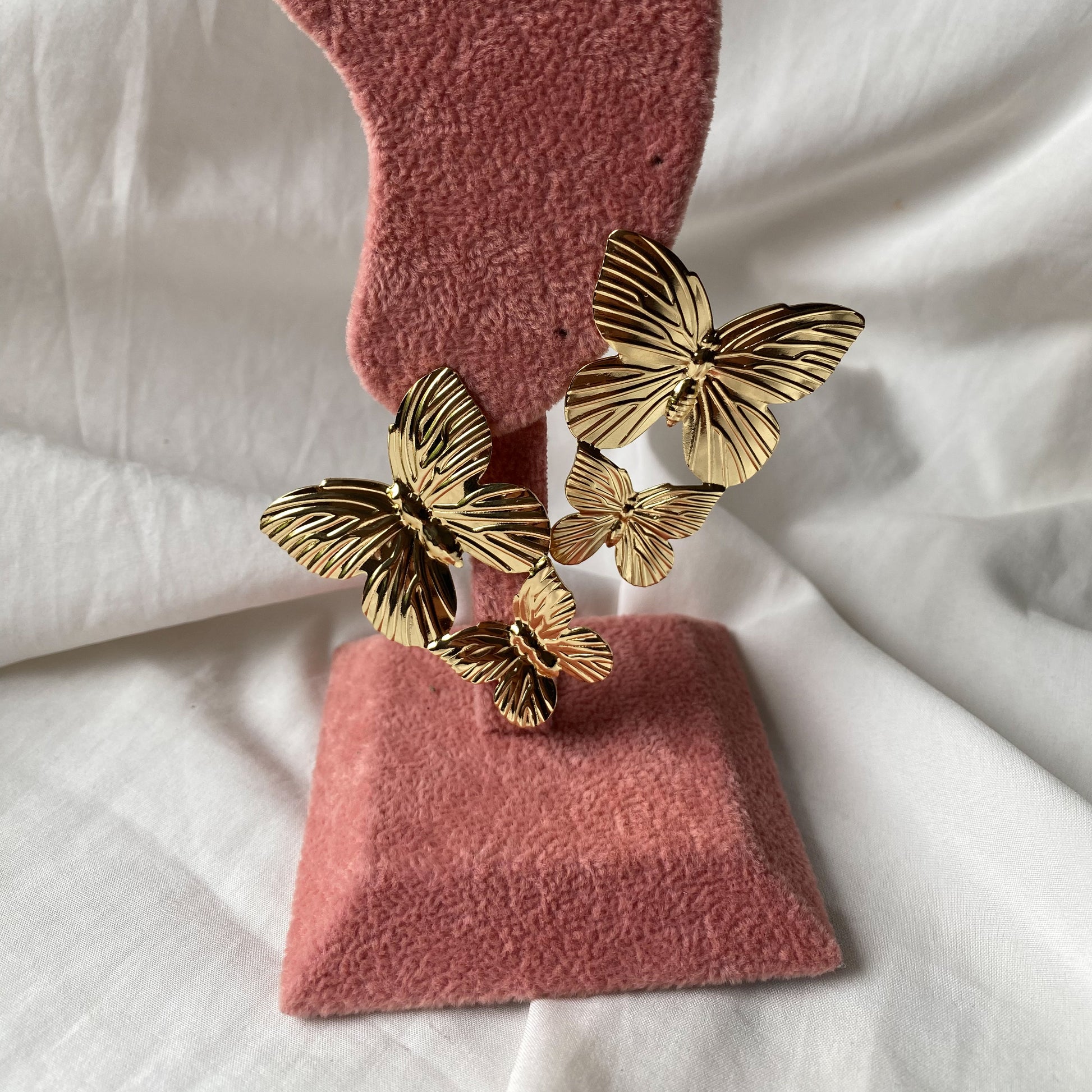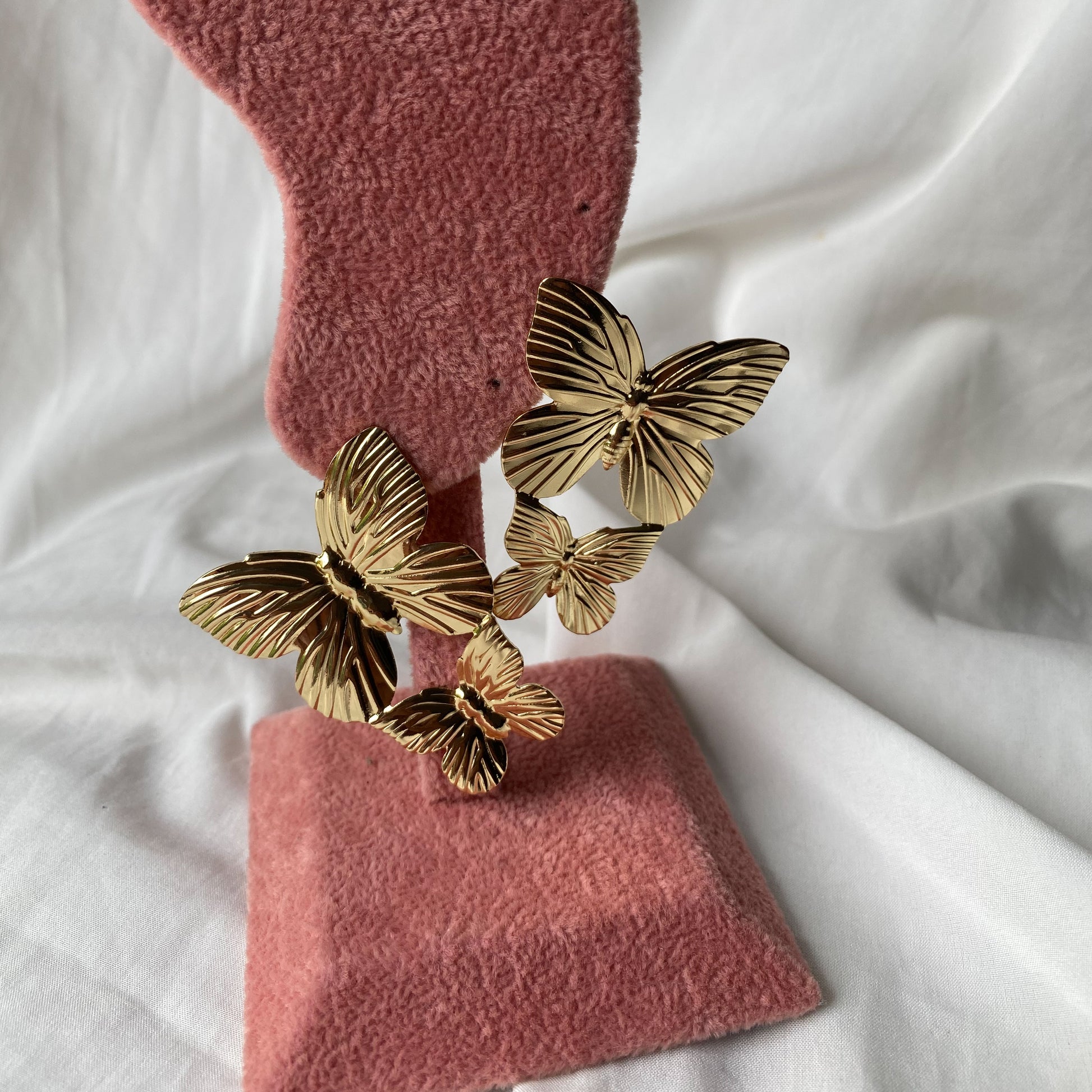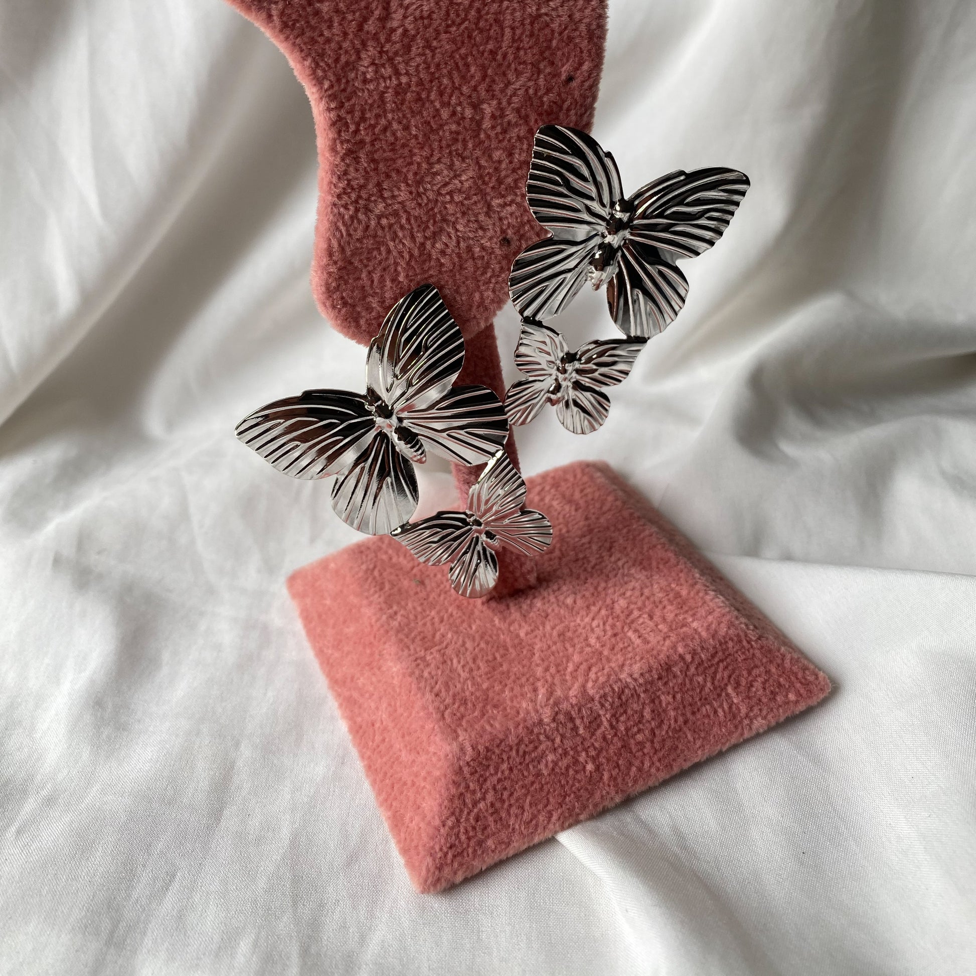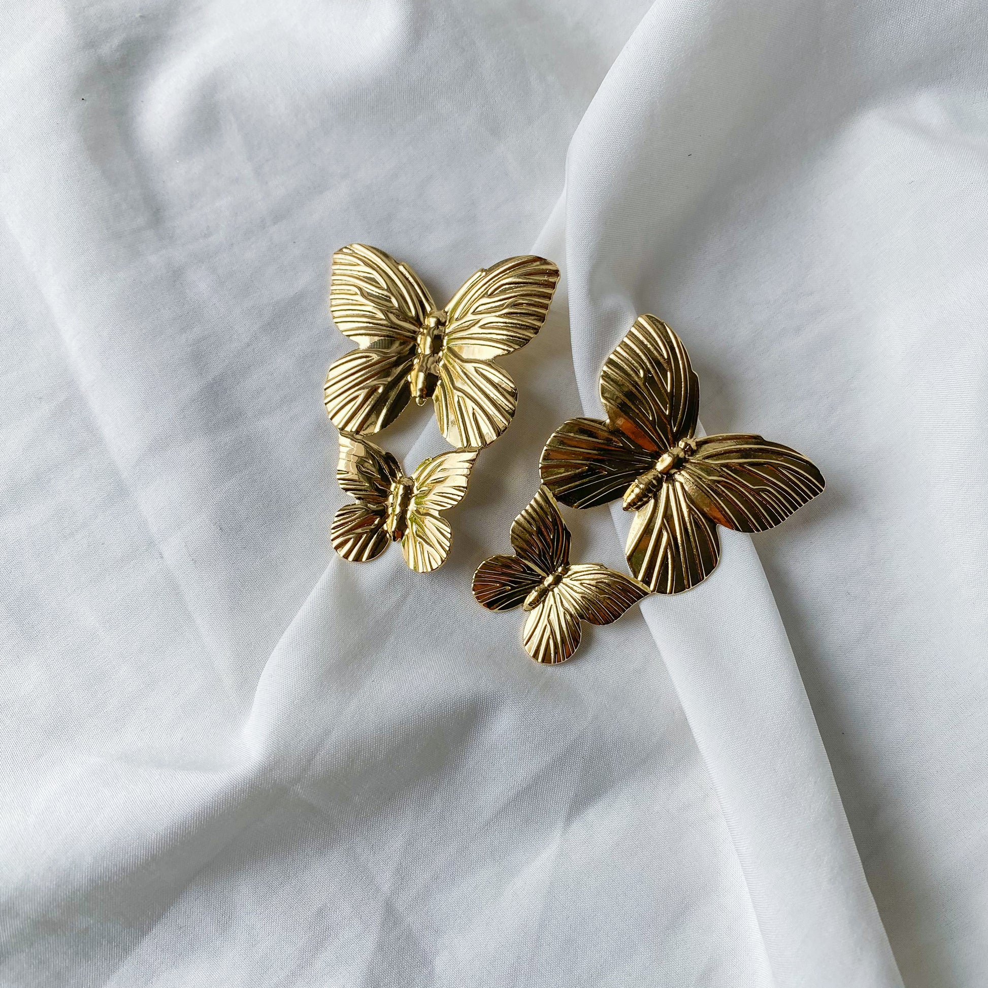 Orecchini Pendenti con doppia farfalla. In acciaio inox. Disponibili in oro o argento.