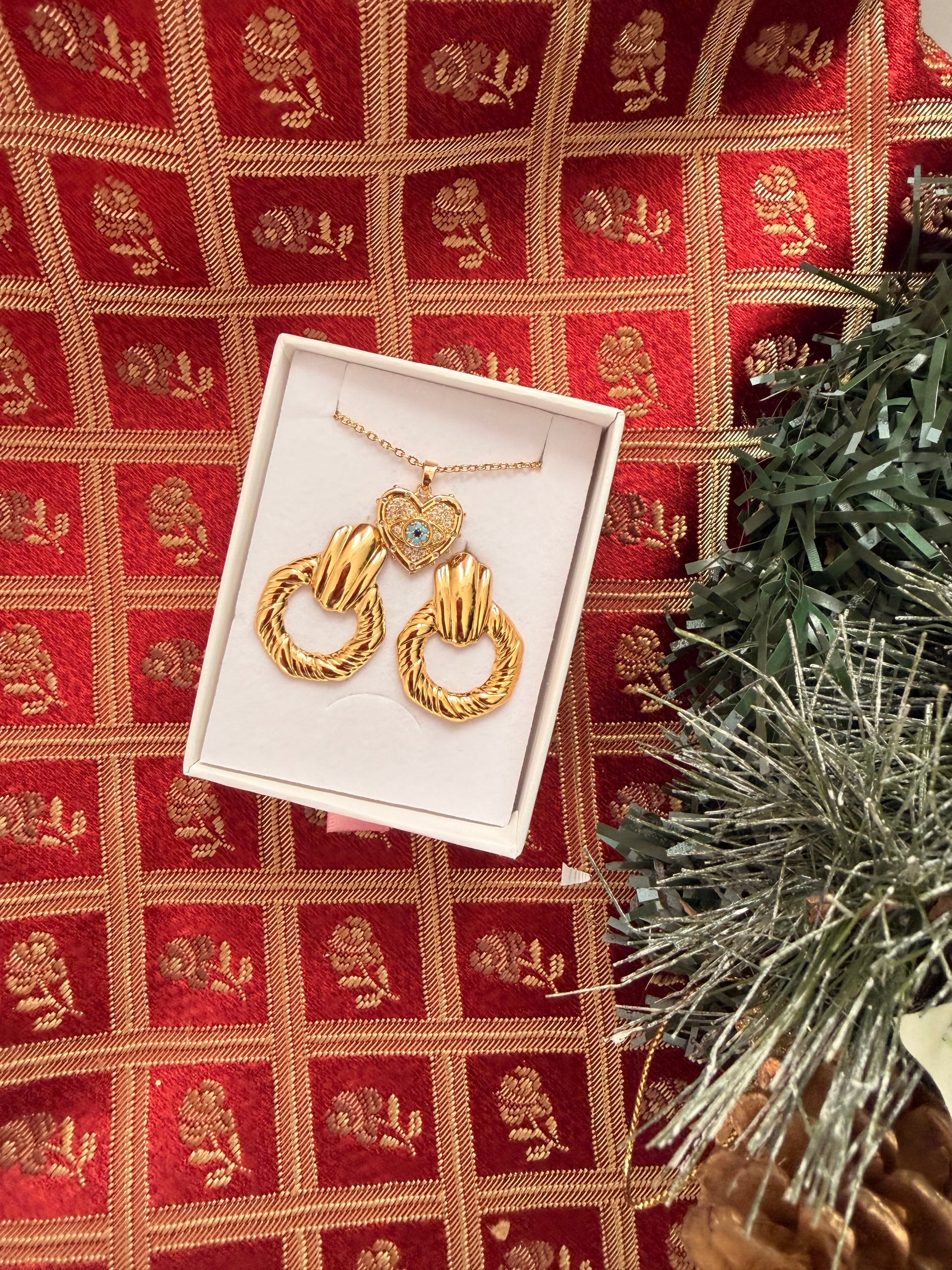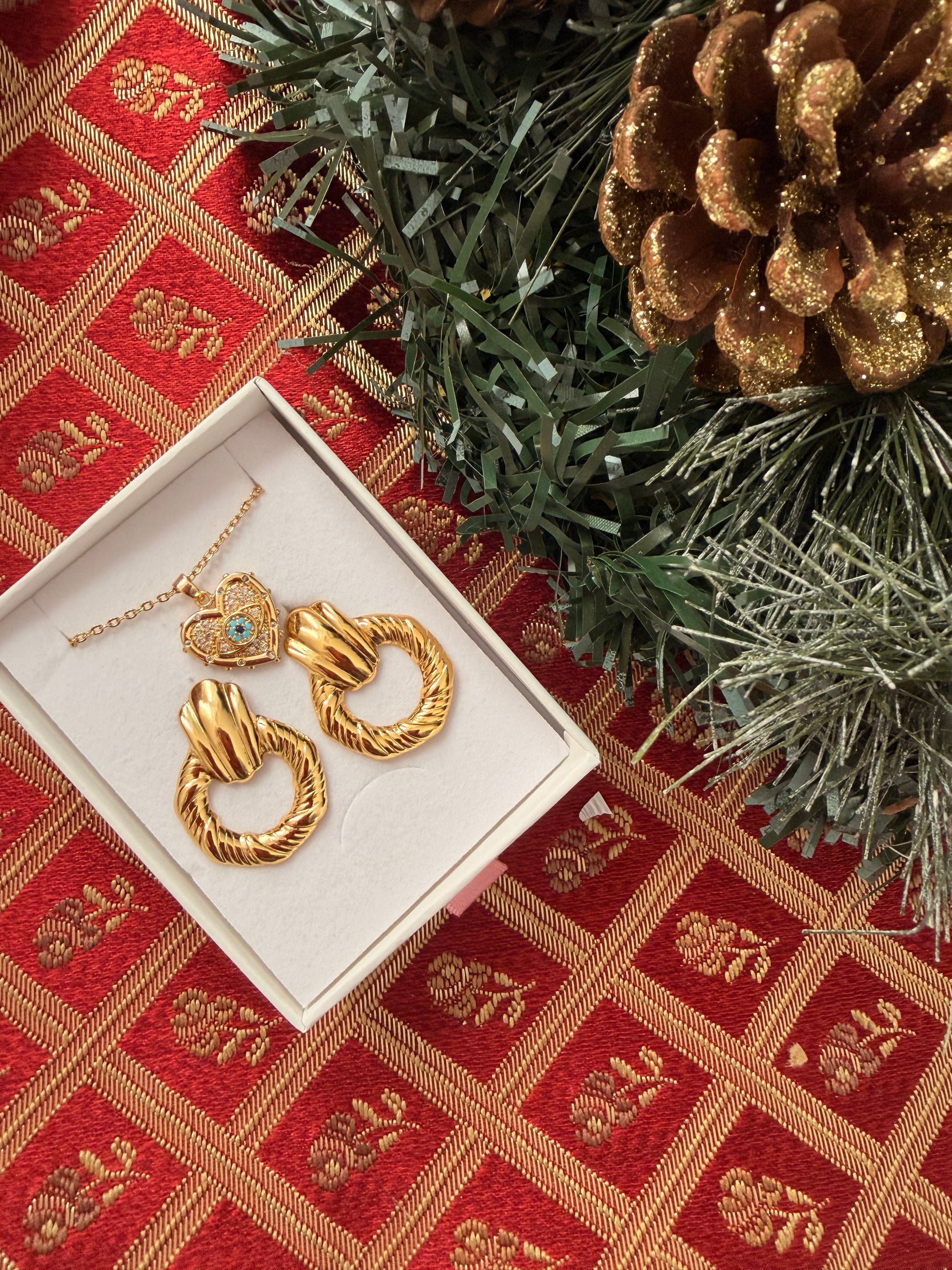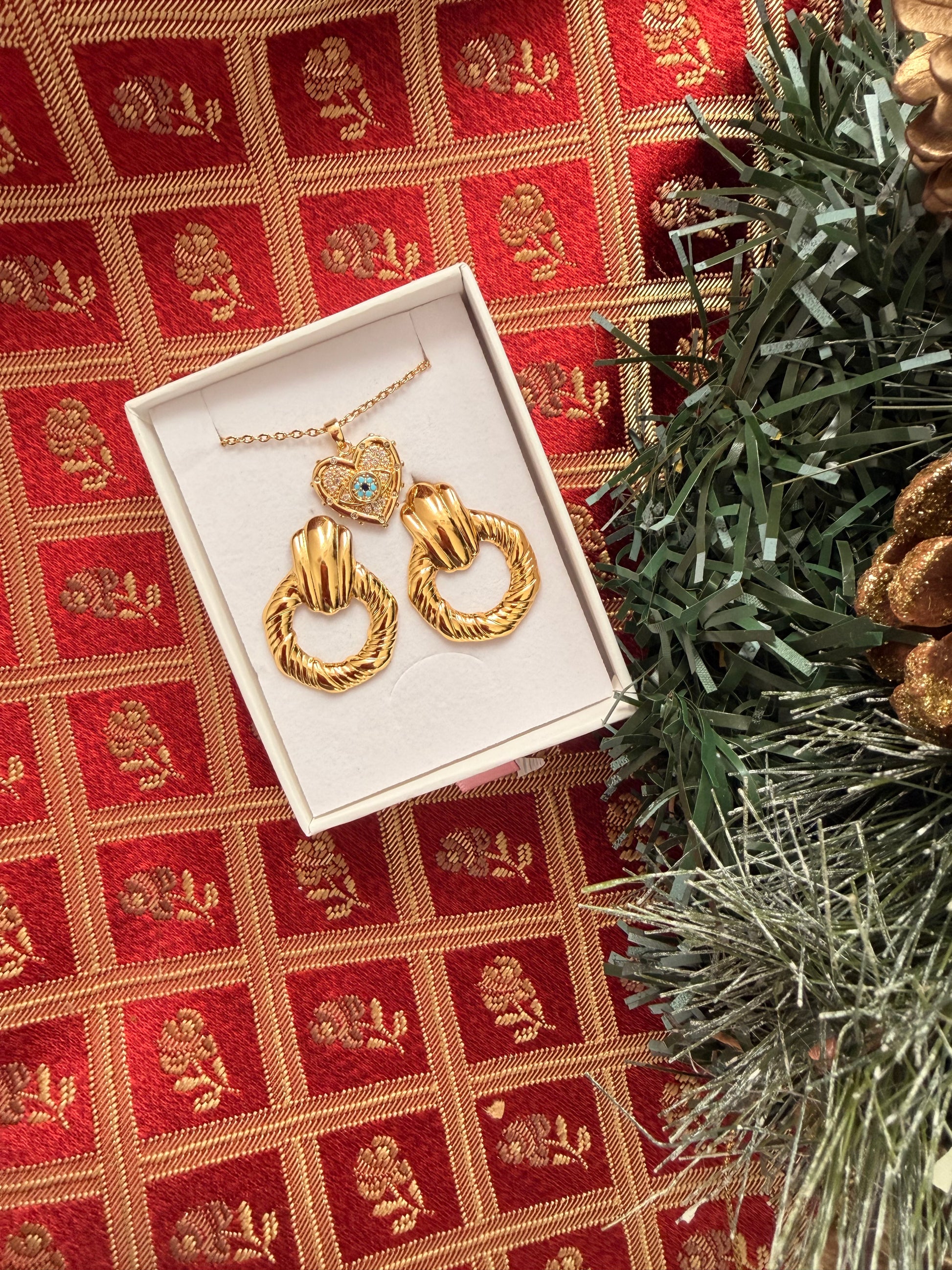 Set natalizio: collana a cuore+orecchini a lobo. Colore oro. In acciaio inox