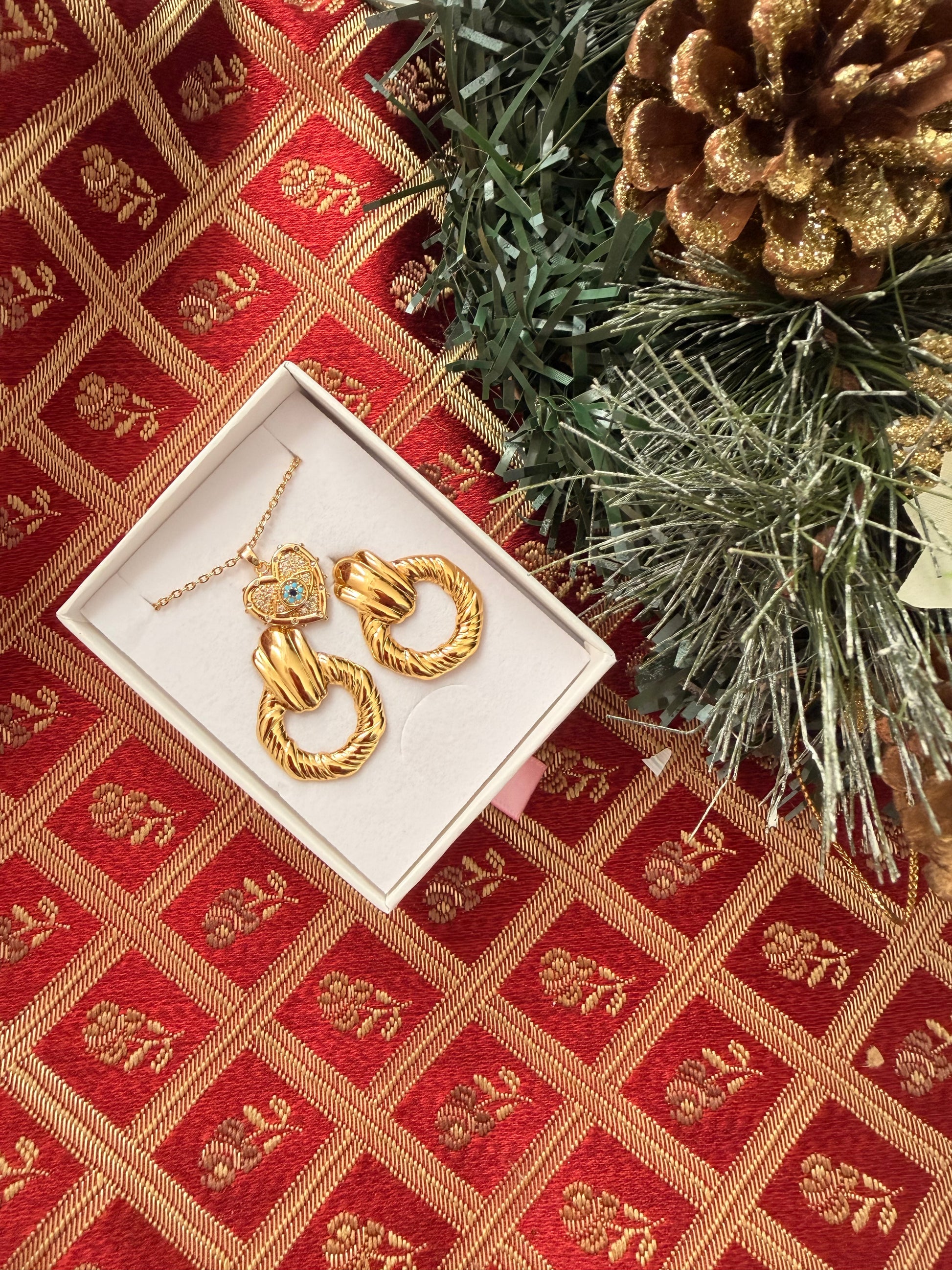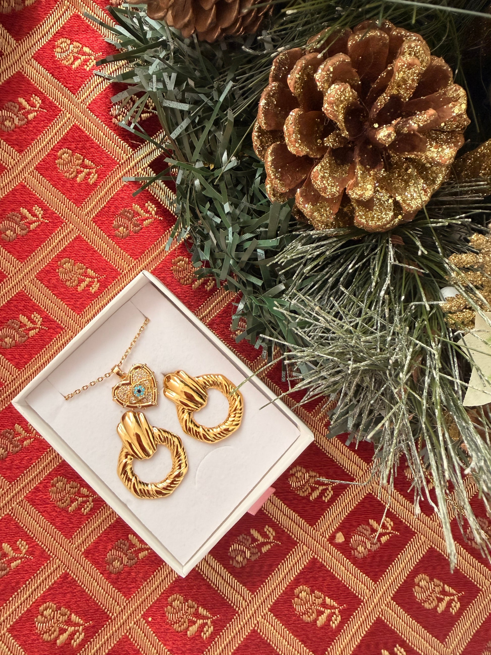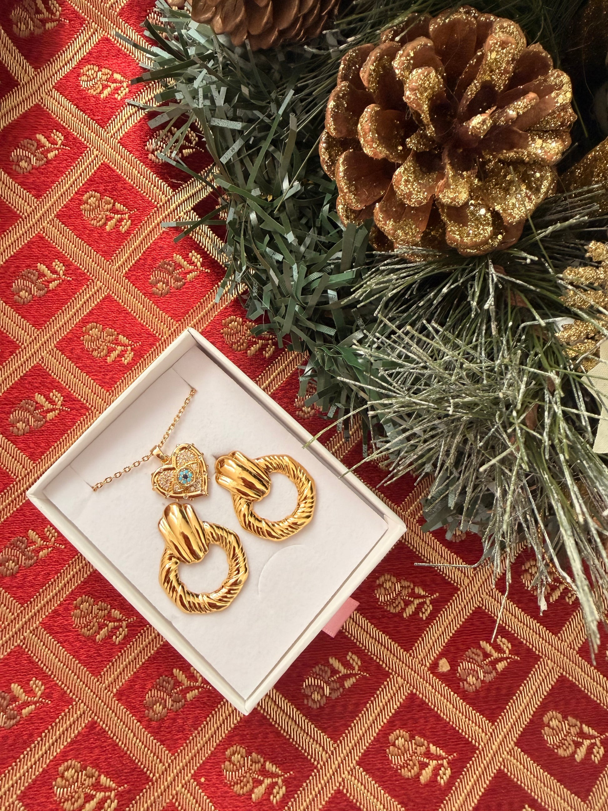 Set natalizio: collana a cuore+orecchini a lobo. Colore oro. In acciaio inox