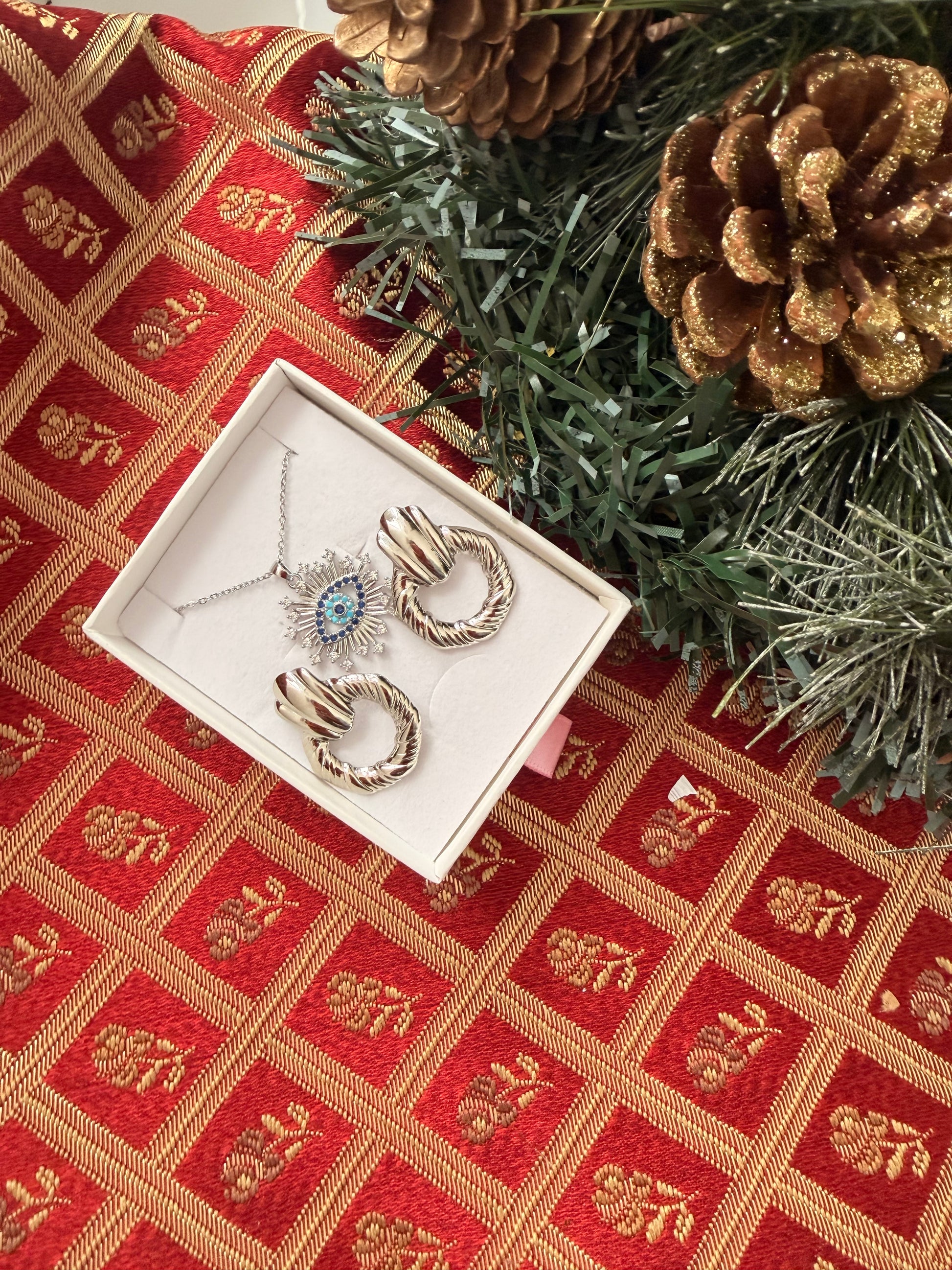Set natalizio: collana con occhio e strass+orecchini a lobo. Colore argento. In acciaio inox